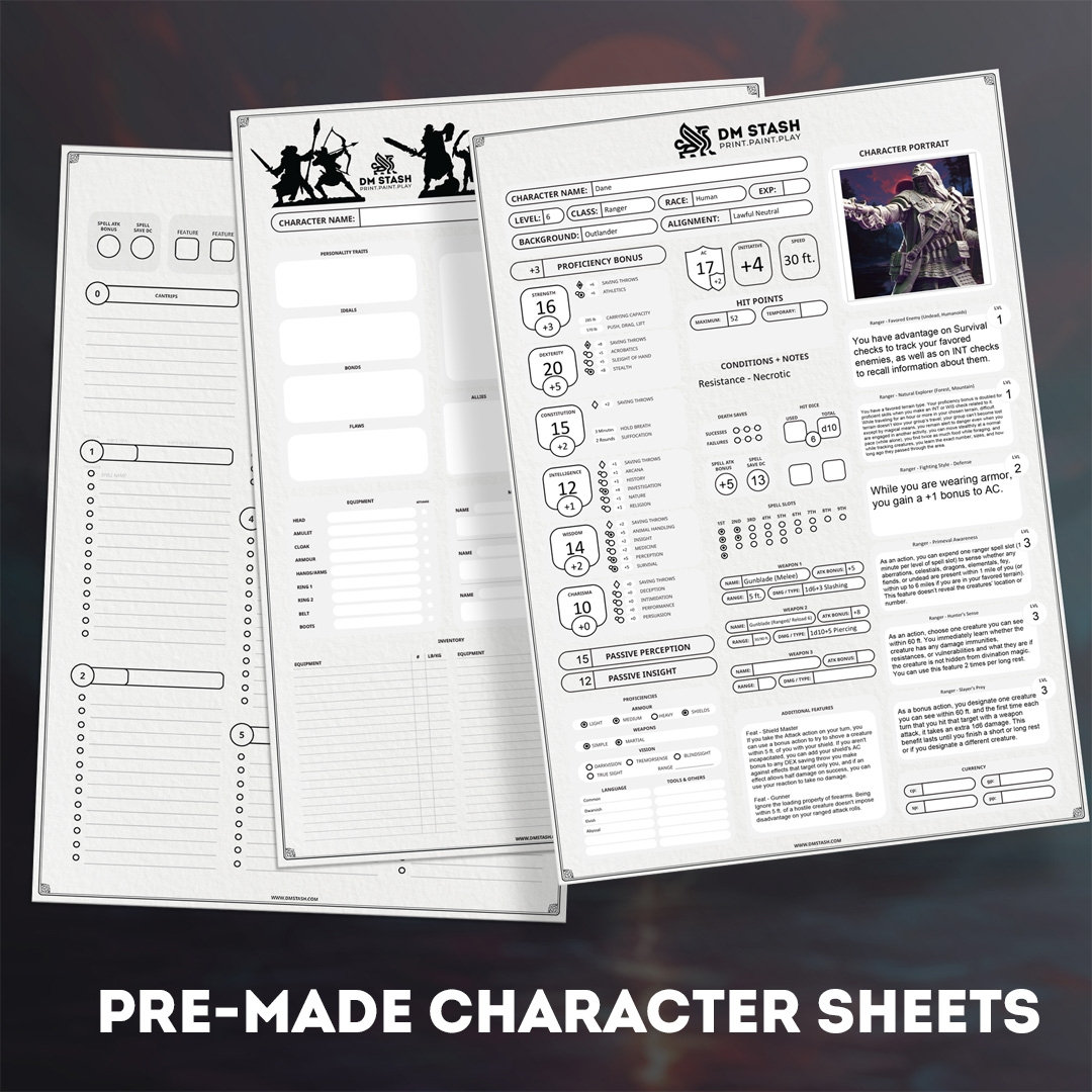 3x vorgefertigte Charakterbögen mit Hintergrundgeschichten für schnelles Spielen